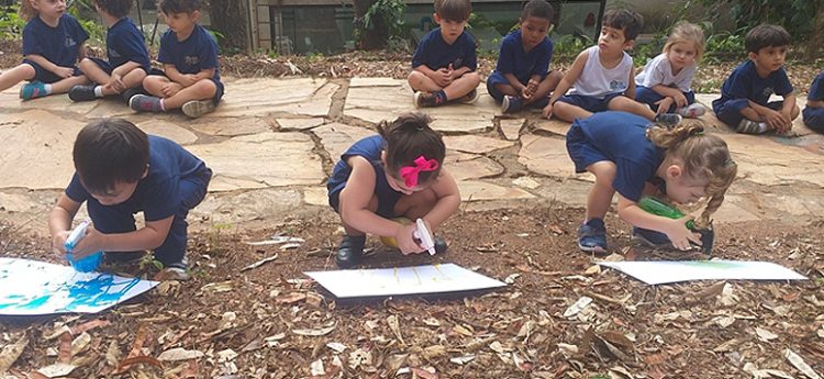 Um dos espaços preferidos pelas crianças do Maternal 2, Turma da Roberta, é a Mata. Pois é lá que eles ficam à vontade para experimentar e vivenciar diversas experiências, em contato com a natureza e por que não realizar uma atividade de pintura nesse espaço tão agradável?