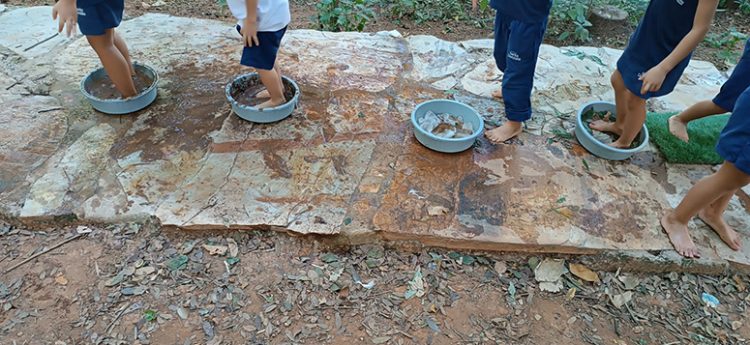 O mais incrível foi o trabalho sensorial, sensory walking. Usando materiais como grama, lama, “neve”, água e outros elementos, as crianças puderam sentir com seus pezinhos o que os personagens da história estavam vivenciando. Imagine a empolgação delas ao pisarem na mud ou sentirem a snow! A atividade proporcionou uma experiência sensorial única, conectando os pequenos com o enredo da história e, claro, aproximando mais a língua inglesa de suas vidas cotidianas.