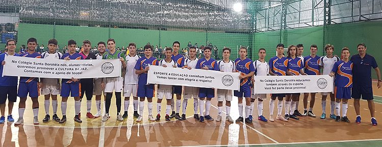 Nesse contexto, temos o Esporte Escolar, através do qual trabalhamos valores essenciais para a formação integral de nossos alunos, e educamos nossas crianças e jovens dentro do esporte competitivo sob uma nova ótica, vivenciando o esporte de forma ética e positiva. Entre as ações do projeto, teremos conversas com os pais de atletas e alunos, no sentido de incentivarem seus filhos e também respeitarem os envolvidos nas partidas: árbitros, torcedores, adversários. Estamos criando momentos de reflexão com os atletas sobre a importância de atitudes positivas no esporte, criando uma CULTURA DA PAZ no esporte, de forma que nossos atletas sejam multiplicadores de valores éticos.